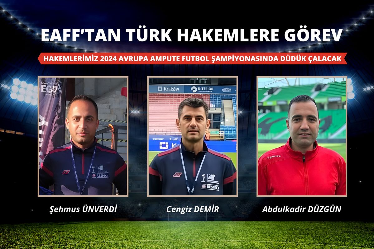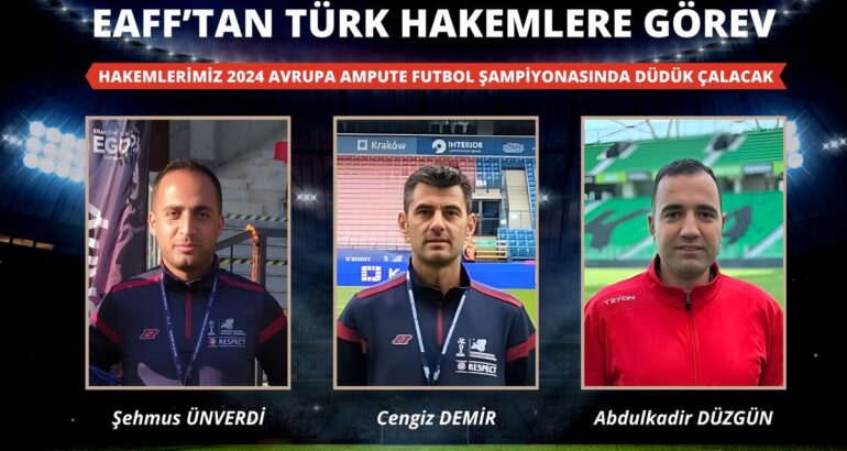 Avrupa Ampute Futbol Federasyonu (EAFF) tarafından 1-8 Haziran tarihleri arasında Fransa’da düzenlenecek olan ve Milli Takımımızın da yer alacağı Avrupa Ampute Futbol Şampiyonasında düdük çalacak olan hakemlerimiz, EAFF tarafından turnuvaya davet edilmiştir.