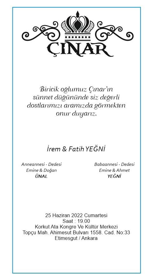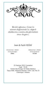 İlimiz gözlemcilerinden Fatih YEĞNİ’ nin çok değerli oğlu Çınar için; 25 Haziran 2022 Cumartesi Günü Saat 19:00’da Korkut Ata Kongre ve Kültür Merkezi’nde sünnet töreni düzenlenecektir.