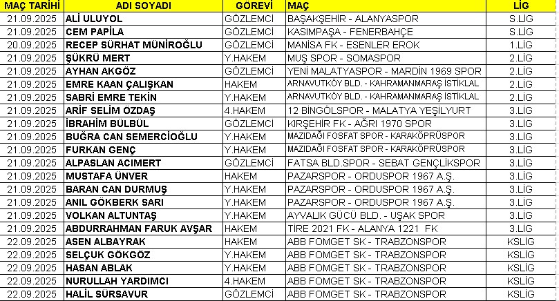 Tüm Klasmanlarda Görev Yapacak Üyelerimize Başarılar DilerizBu Hafta Tüm profosyenel liglerde Ankara Bölgemizden görev yapacak Üyelerimize başarılar dilerizTFFHGD ANKARA ŞUBESİ 2025-09-22