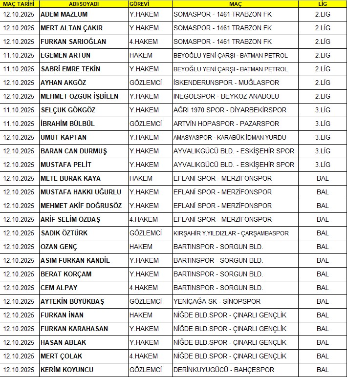 Tüm Klasmanlarda Görev Yapacak Üyelerimize Başarılar DilerizBu Hafta Tüm profosyenel liglerde Ankara Bölgemizden görev yapacak Üyelerimize başarılar dilerizTFFHGD ANKARA ŞUBESİ 2025-10-09