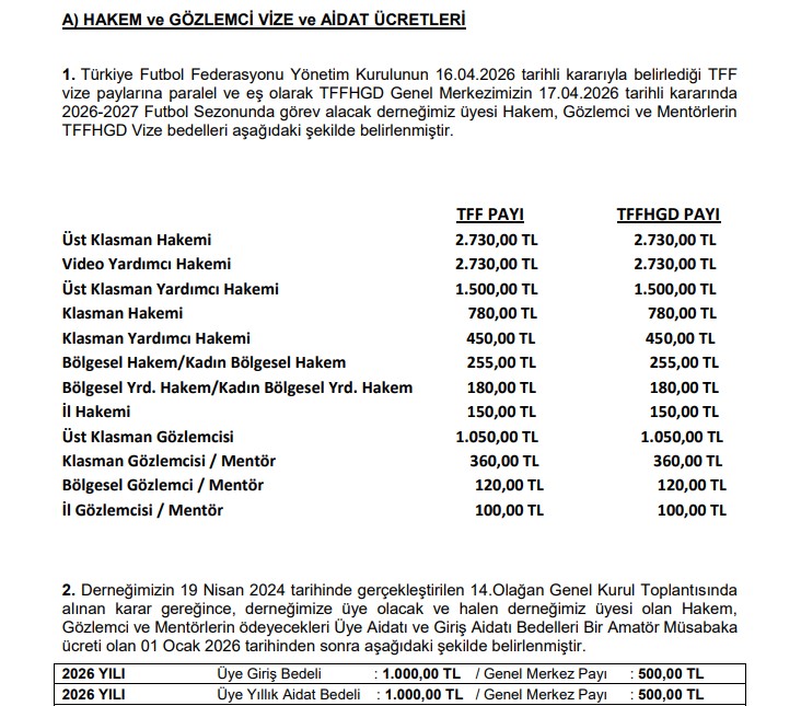 TFF Payı yatırılırken açıklama kısmına ”isim -soyisim 2026-2027 vize bedeli” yazılacaktır. TFF HESABINA PARA YATIRMA İÇİN SON GÜN 29 NİSAN 2026 ÇARŞAMBA günüdür.